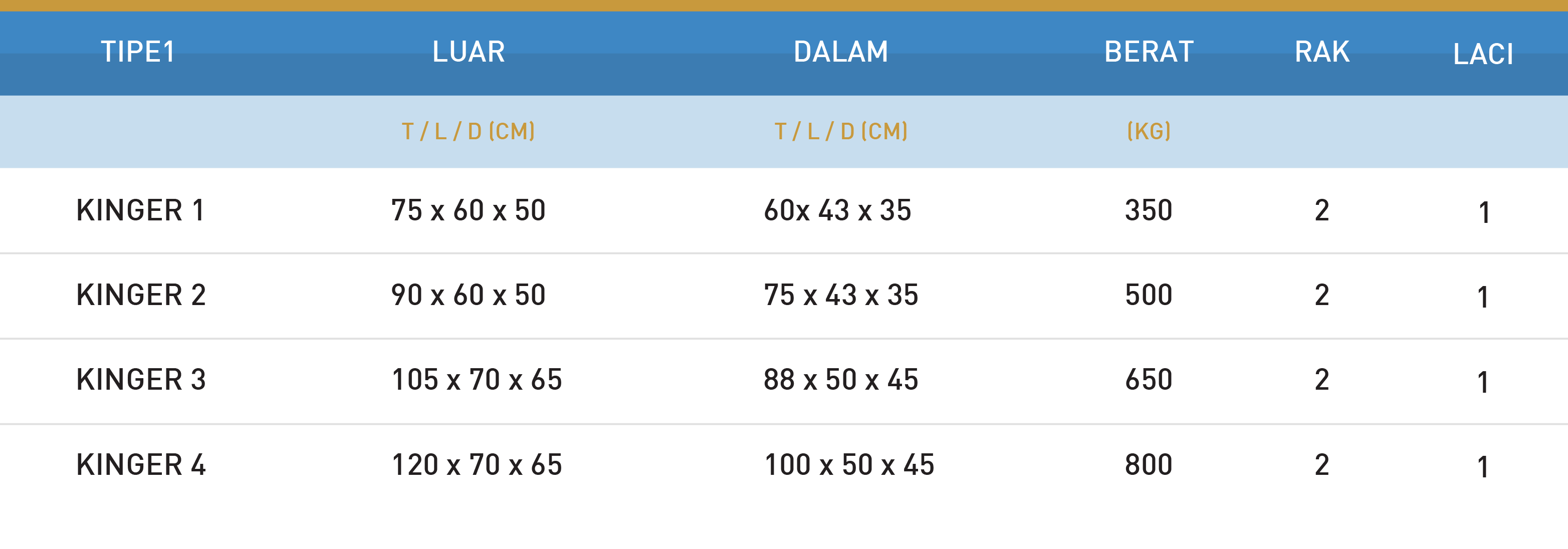 Brankas Kinger menawarkan keseimbangan ideal antara kapasitas dan keamanan. Dengan tinggi mulai dari 75 cm hingga 120 cm, Kinger dirancang untuk memenuhi kebutuhan penyimpanan skala menengah— baik di Rumah, Kantor, Toko, maupun Hotel—dengan fitur anti-api dan sistem pengamanan anti-bobol dalam balutan desain elegan dan kokoh.